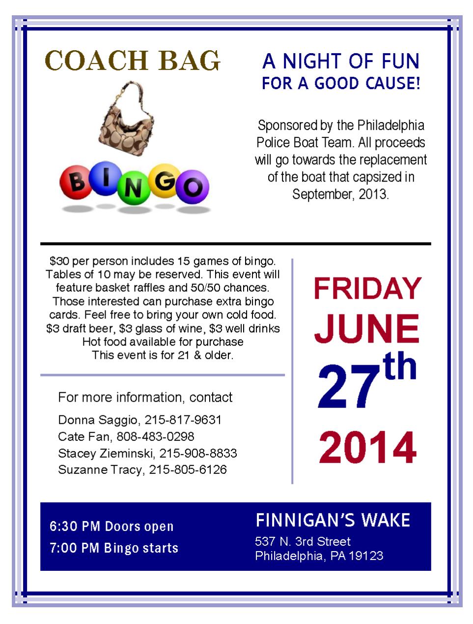 Coach Bag Bingo – A night of fun for a good cause! Sponsored by the Phila Police Boat Team. All proceeds will go towards the replacement of the boat that capsized in Sept 2013. $30 per person includes 15 games of bingo. Tables of 10 may be reserved. Basket raffles and 50/50 chances. Feel free to bring your own food. $3 draft beer, $3 glass of wine, $3 well drinks. Hot food avail for purchase. 21 yrs and old. Finnigans Wake, 537 N 3rd St., Phila. Doors open 6:30pm. Bingo starts at 7pm