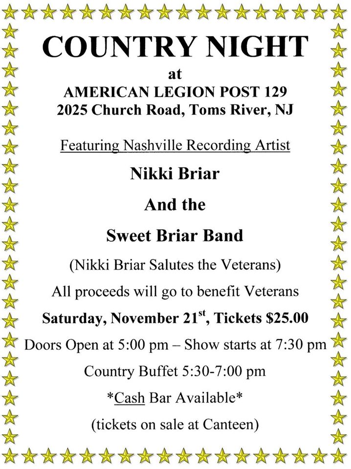Country Night at American Legion Post 129. Featuring Nashville Recording Artist Nikki Briar and the Sweet Briar Band. All proceeds benefit Veterans. Saturday, Nove 21st tickets $25. Doors open at 5pm. Show starts at 7:30pm. Country Buffet 5:30-7pm. Cash bar available.