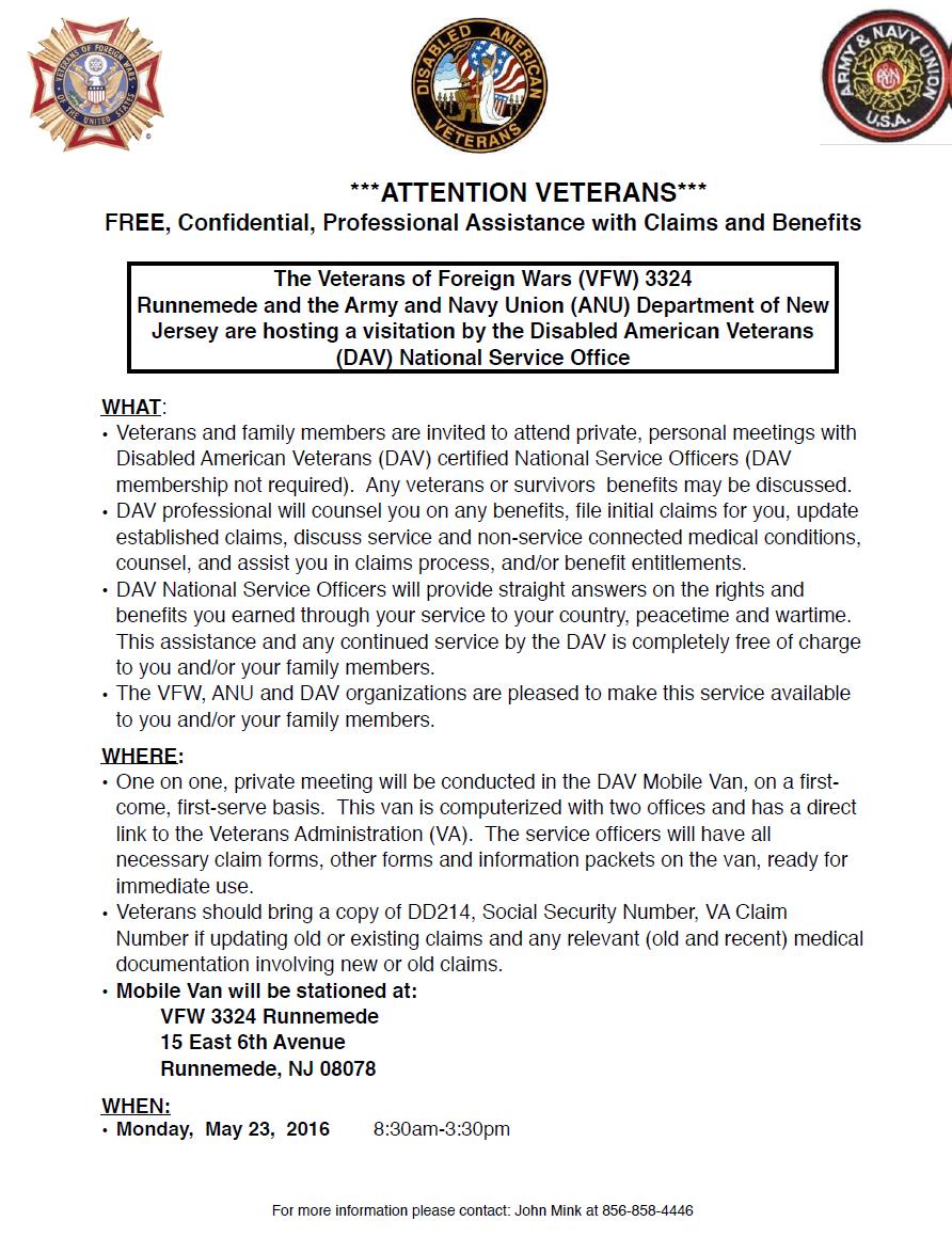 Disabled American Veterans National Mobile Service Van will be at the VFW Runnemede Post 3324 on Monday , May 23 , from 8:30 am to 3:30 pm, Please remind any of your veterans a/o veterans family members of this unique, confidential opportunity to receive information and pursue any issues they might have with the VA, with the expert help of the DAV National Service Officers.