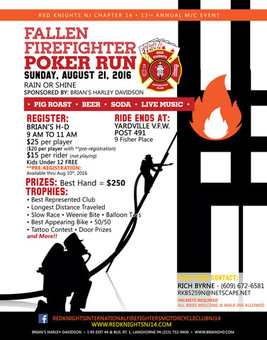 The poker run starts at Brian’s Harley Davidson, 600 Flowers Mill Road in Langhorne. Registration is from 9:00 am until 11:00 am. The ride fee is $25.00 per rider and $15.00 per passenger. If you pre-register at Brian’s Harley Davidson, you will save $5.00 on the rider’s fee. The ride will be about 50 miles and will end in Hamilton. All the proceeds will go to a family of a firefighter who died in the line of duty. For more information call (609) 672-6581