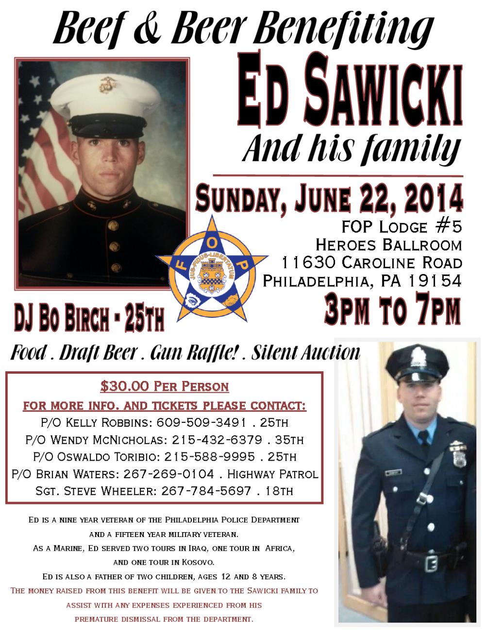 Beef and Beer Benefiting Ed Sawicki and his family. 3pm-7pm. Food, Draft Beer, Gun Raffle, Silent Auction. $30 per pseron. More info and tickets call PO Kelly Robbins at 609-509-3491, PO McNicholas at 215-432-6379 or Sgt Wheeler at 267-784-5697.