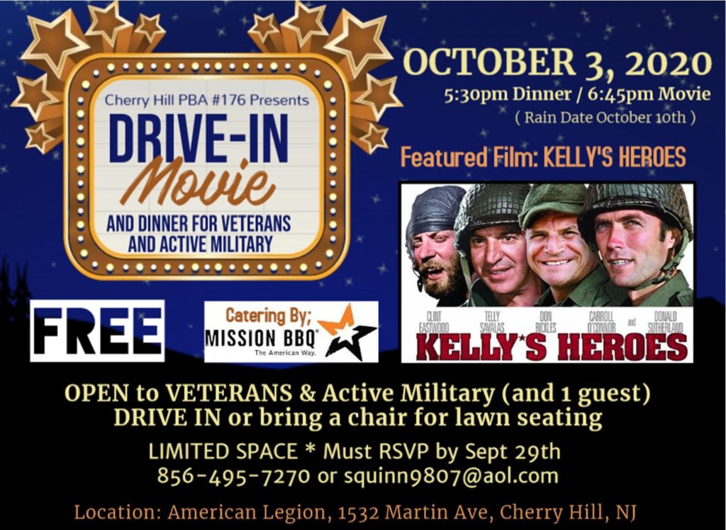 OPEN to Veterans & Active Military (and 1 guest each). Featured Film, Kelly’s Heroes, Dinner Catered by MISSION BBQ . DRIVE IN or bring a chair for lawn seating. (Rain date Oct 10th). Location: American Legion, 1532 Martin Ave, Cherry Hill, NJ 08002