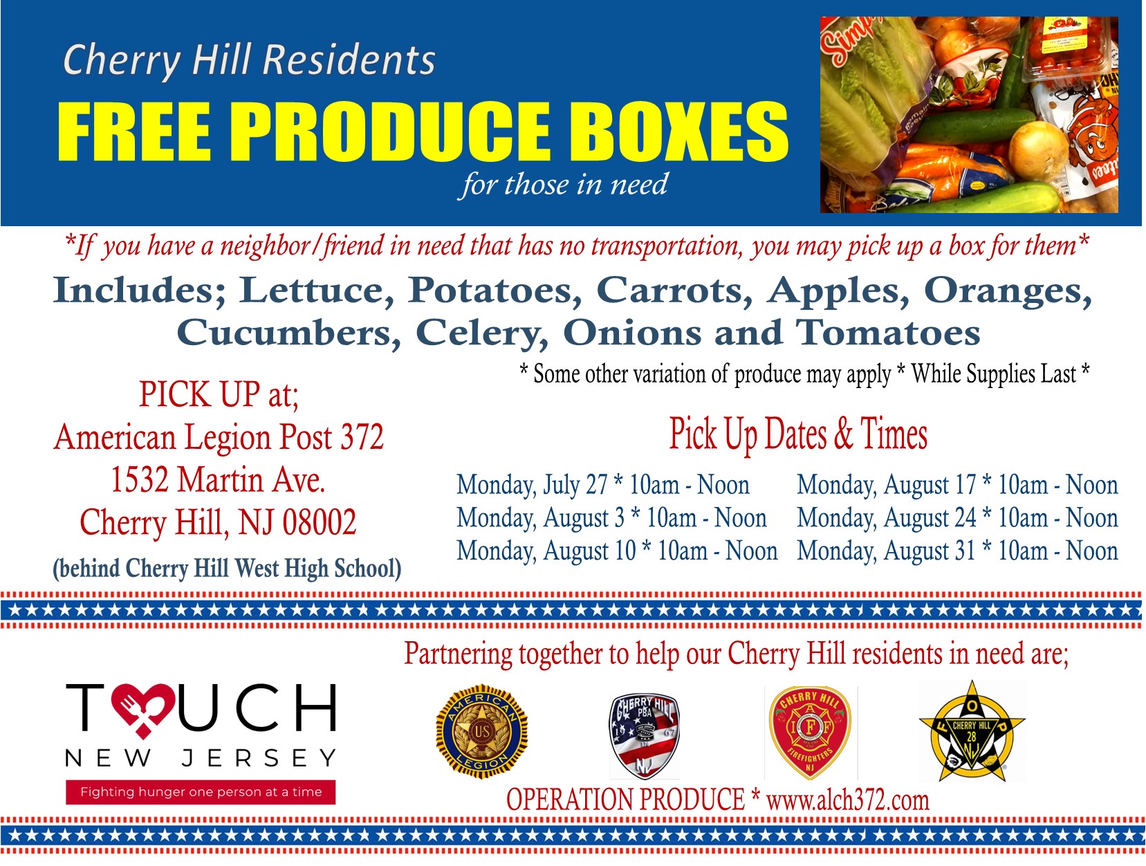 Free Produce Boxes – Operation Produce (Touch NJ, American Legion, Cherry Hill PBA, Cherry Hill Firefighters, Cherry Hill FOP)