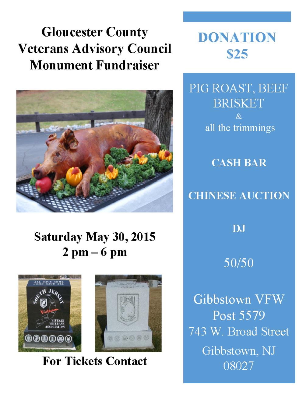 Gloucester County Veterans Advisory Council Fundraiser. 2pm – 6pm. All money raised for this will put towards 2 new monuments at the Gloucester County Veterans Cemetery. PIG ROAST, BEEF BRISKET & all the trimmings. CASH BAR, CHINESE AUCTION, DJ, 50/50. Donation $25. For tickets contact Bob Jonas at 856-401-7688