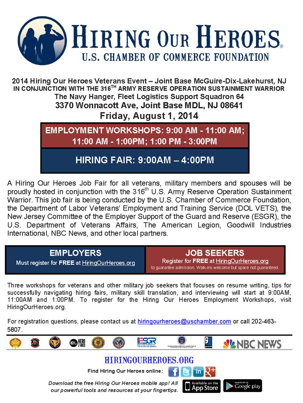 Join us Friday, August 1, 2014 from 9:00 a.m. to 4:00 p.m. for a job fair Job Fair proudly hosted in conjunction with the 316th Army Reserve Operation Warrior Program for veteran job seekers, active duty military members, guard and reserve members, and military spouses at the Navy Hanger, Fleet Logistics Support Squadron 64, 3370 Wonnacott Ave, Joint Base MDL, NJ 08641.