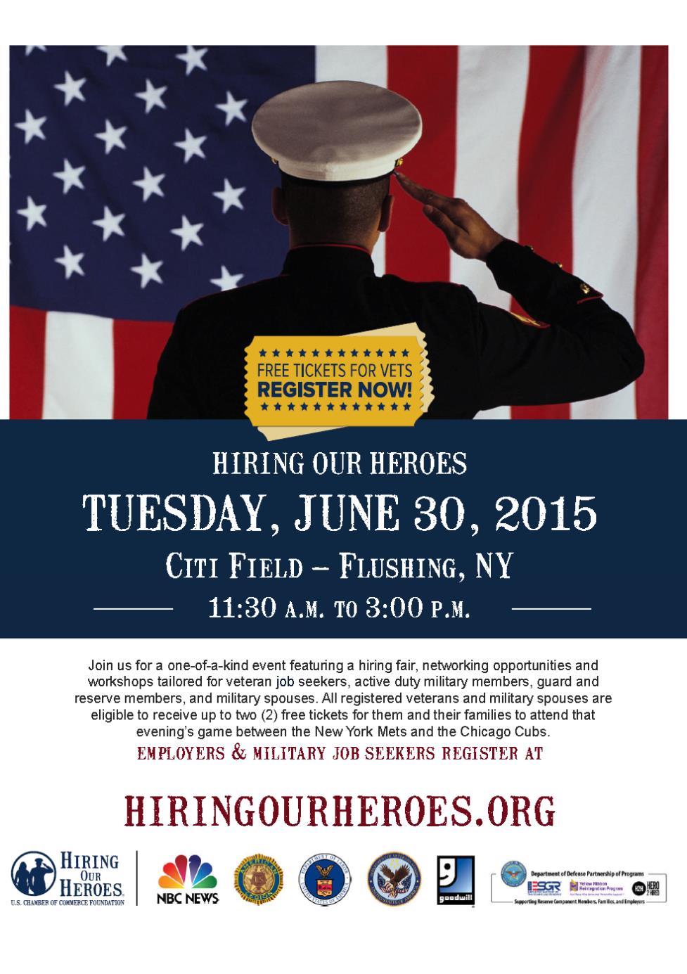 Join us for a one of a kind event featuring a hiring fair, networking opportunities and workshops tailored for veteran job seekers, active duty military members, guard and reserve members, and military spouses. All registered veterans and military spouses are eligible to receive up to 2 free tickets for them and their families to attend that evenings game between NYMets and the Chicago Cubs. For more information and to register go to http://www.hiringourheroes.org