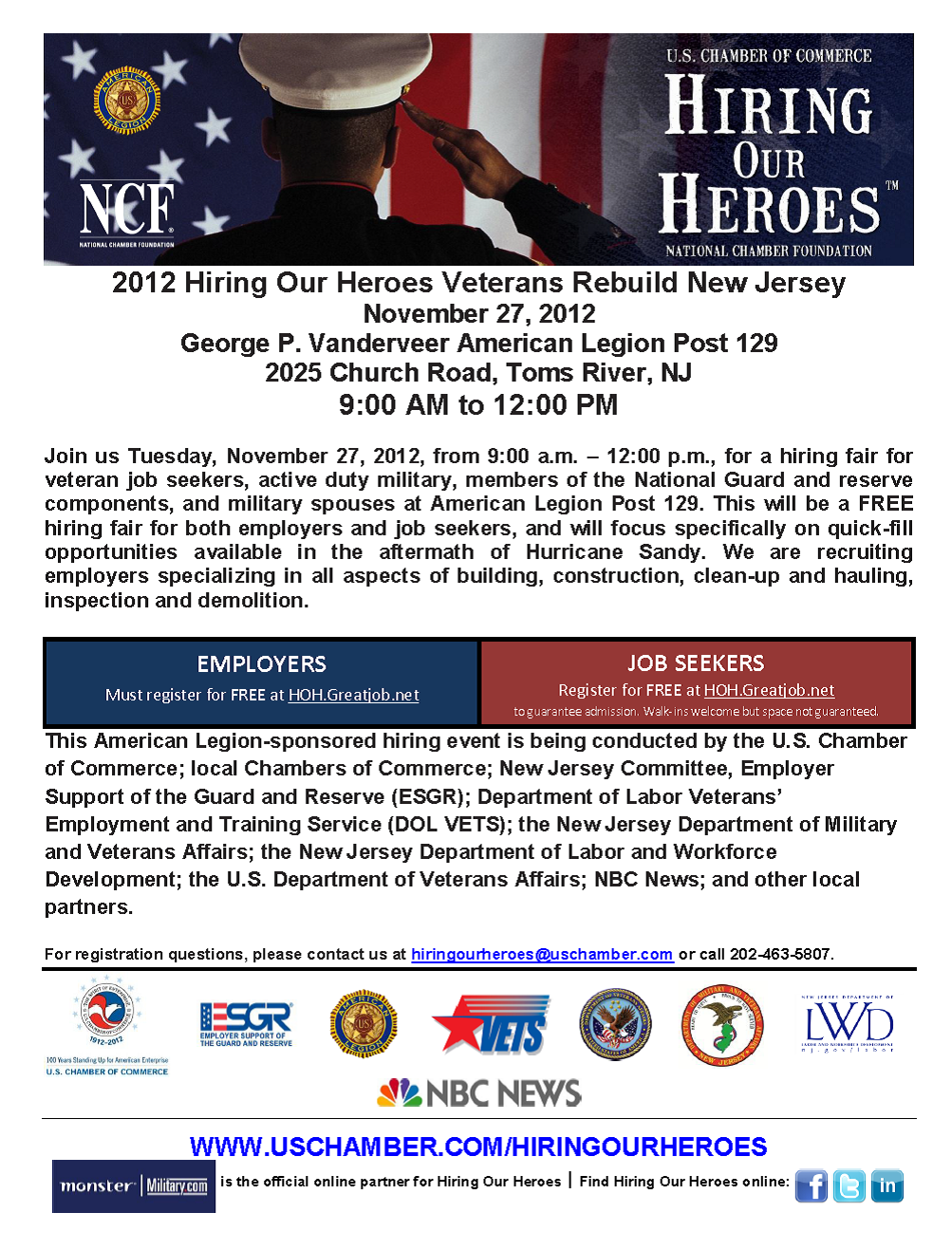 Trenton Nov. 9, 2012 – The U.S. Chamber of Commerce, ESGR and The American Legion is announcing an accelerated scheduled Hiring Our Heroes (HOH) job fair, which is part of a nationwide effort to help veterans and military spouses find meaningful employment.   This expedited job fair will focus specifically on quick-fill opportunities available in the aftermath of Hurricane Sandy. We are recruiting employers specializing in all aspects of building, construction, clean-up and hauling, inspection and demolition.