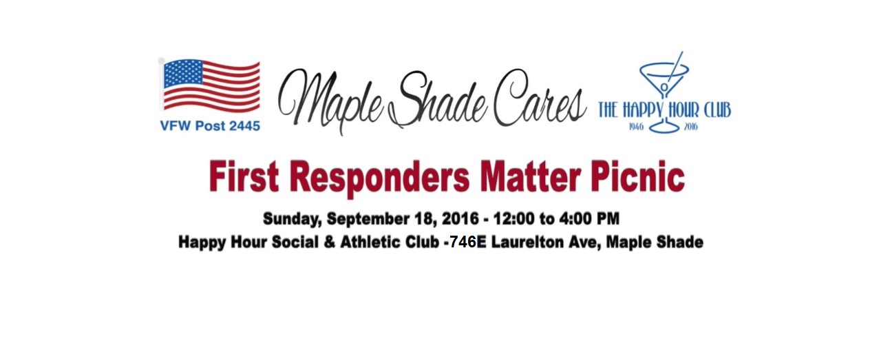 The Maple Shade Happy Hour Social Club and VFW Post 2445 are hosting a picnic for appreciation of all our First Responders. Sunday, Sept 18th from 12-4pm. There will be police, fire and EMT vehicles on display and free food for those in attendance.