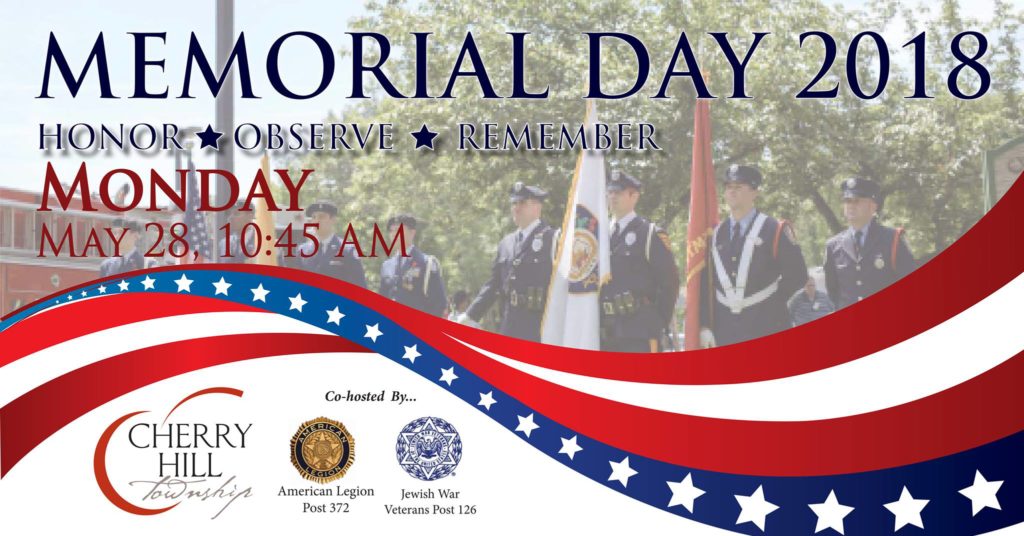 Monday, May 28th – 10:45am – Services at Cherry Hill Township Municipal Bldg, Mercer St, Cherry Hill, NJ. Veterans and active-duty military personnel will be honored by Mayor Chuck Cahn, Township Council and local elected officials at this annual Memorial Day ceremony. The Ceremony, co-hosted by American Legion Cherry Hill NJ Post 372 and Jewish War Veterans Cherry Hill NJ Post 126, begins with a special fly over from the Air National Guard 177th Fighter Wing at 11 a.m. and includes a musical tribute to our Armed Forces by the Cherry Hill Pine Barons Chorus. This year’s keynote speaker will be Colonel Lucretia McClenney.