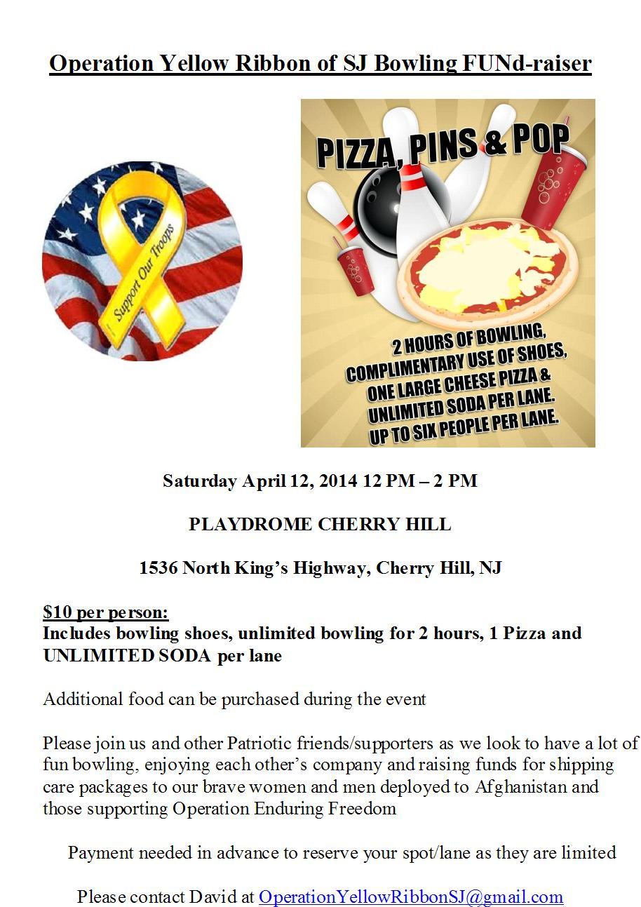 Includes bowling shoes, unlimited bowling for 2 hours, 1 Pizza and UNLIMITED SODA per lane. Additional food can be purchased during the event. Please join us and other Patriotic friends/supporters as we look to have a lot of fun bowling, enjoying each other’s company and raising funds for shipping care packages to our brave women and men deployed to Afghanistan and those supporting Operation Enduring Freedom. Payment needed in advance to reserve your spot/lane as they are limited. Please contact David at OperationYellowRibbonSJ@gmail.com