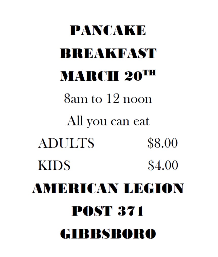 Pancake Breakfast – 8am – 12noon. All you can eat ! Adults $8.00, Kids $4.00.