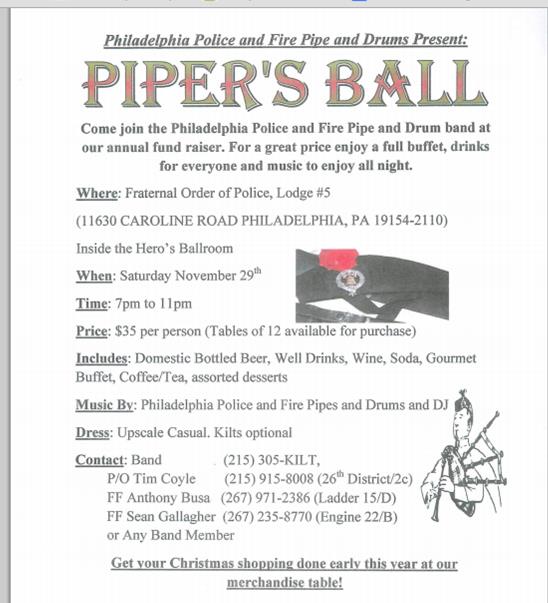 Philadelphia Police and Fire Pipe and Drum Band Annual Fundraiser. Saturday, Nov 29th 7pm -1ppm. $35 per person. Includes Domestic Bottle beer, well drinks, wine, soda, gourmet buffet, coffe/tea, assorted desserts. Music by Phila Police and Fire Pipes and Drums and DJ. Dress; Upscale Casual. Kilts optional. Contact Tim Coyle 215 915-8008, Anthony Rusa 267-971-2386