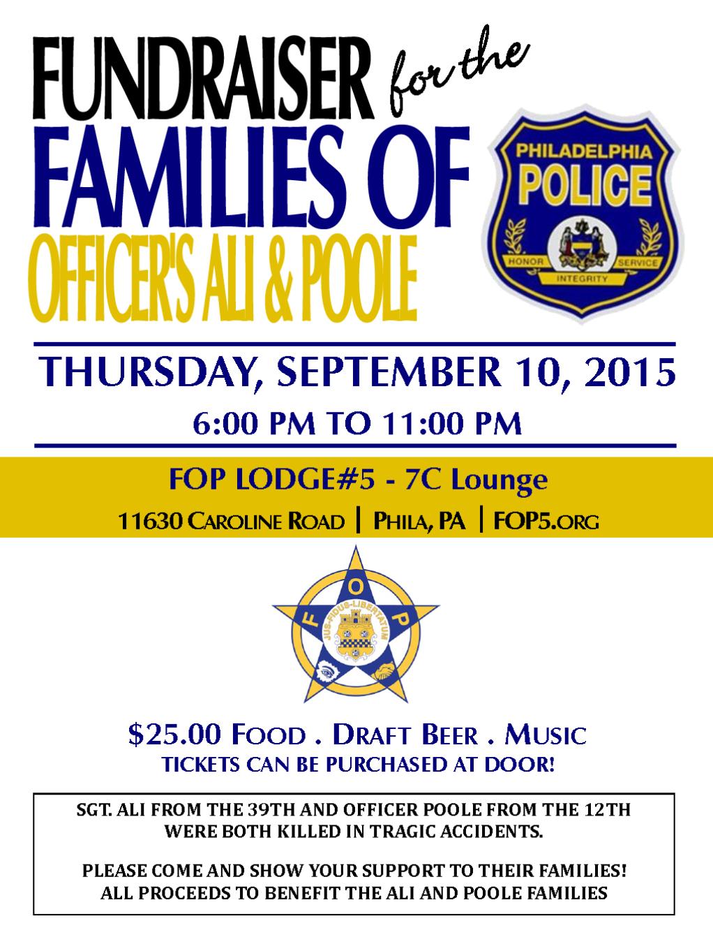 Fundraiser for the families of Officer Ali & Poole. Thursday, Sept 10th 6pm-10pm at FOP Lodge 5. $25 Food, Draft Beer, Music. Tickets can be purchased at door. Sgt Ali from the 39th district adn Officer Poole form the 12th were both killed in tragic accidents..