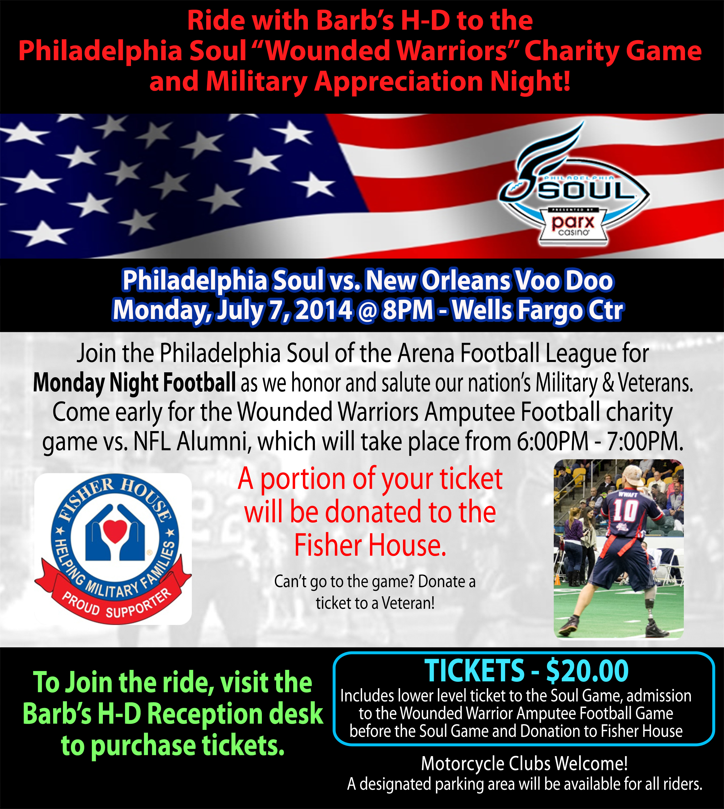 Ride with Barbs HD to the Philadelphia Soul “Wounded Warriors” Charity Game and Military Appreciation Night! To join the ride, call Barbs HD at 856-456 or purchase at Barbs reception desk. Philadelphia Soul v New Orleans Voo Doo. Monday July 7 at 8pm – Wells Fargo Ctr. A portion of your ticket will be donated to the Fisher House. Tickets $20. Includes lower level ticket to the Soul Game, admission to the Wounded Warrior Amputee Football Game before the Soul Game and Donation to Fisher House. Motorcycle Clubs welcome. A designated parking area will be available for all riders.
