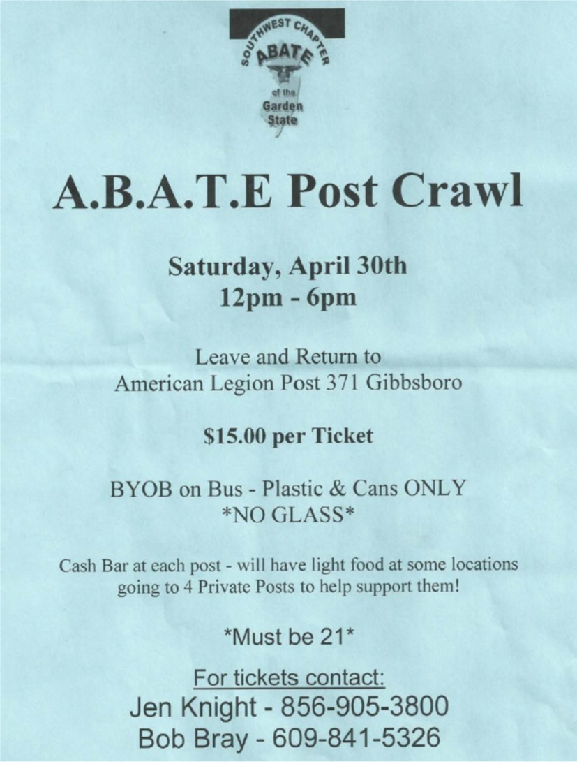 ABATE Post Crawl – Leave and return to American Legion Post 731 Gibbsboro – $15 per ticket. BYOB on Bus – Plastic and Cans only. No Glass. Cash Bar at each Post – will have light food at some lcoations going to 4 private posts to help support them. Must be 21. For tickets contact Jen at 856-905-3800 or Bob at 609-841-5326