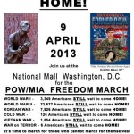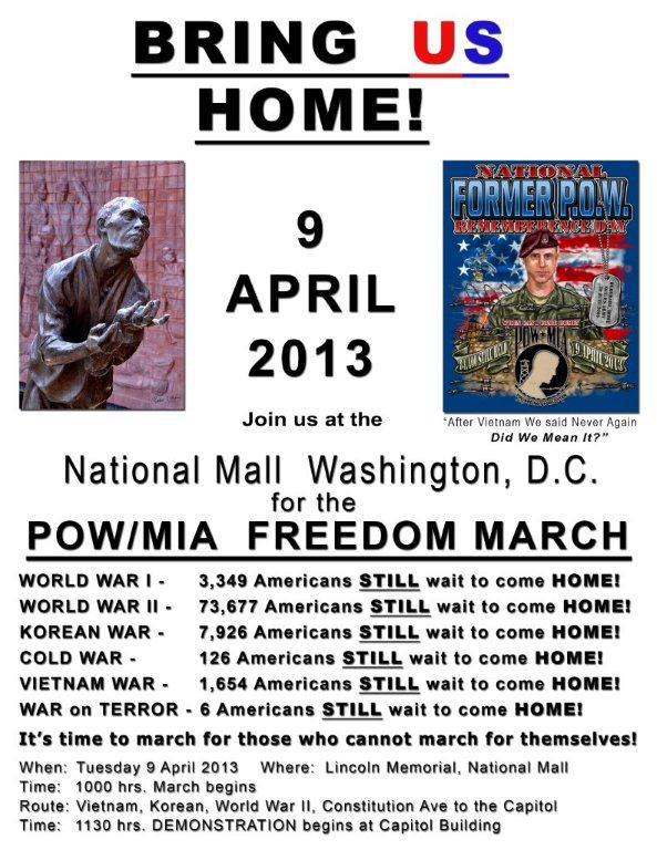 Bring Us Home. Join in the POW/MIA Freedom March. Meet at the Lincoln Memorial in Washington DC – March begins at 10am. Demonstration begins a Capitol Building at 11:30AM