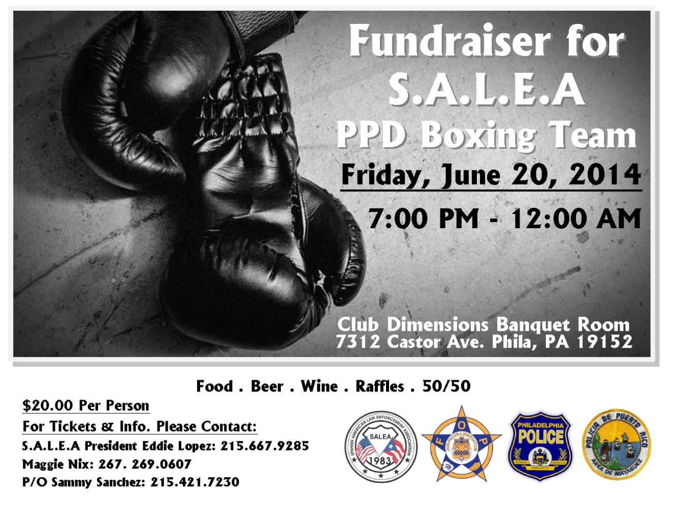 Fundraiser for the S.A.L.E.A. PPD Boxing Team. Friday, June 20th 7pm-midnight. Food, Beer, Wine, Raffles, 50/50. $20 per person. For tickets contact Eddie L at 215-667-9285 or Maggie at 267-269-0607. Location Club Dimensions Banquet Room, 7312 Castor Ave, Phila., PA 19152