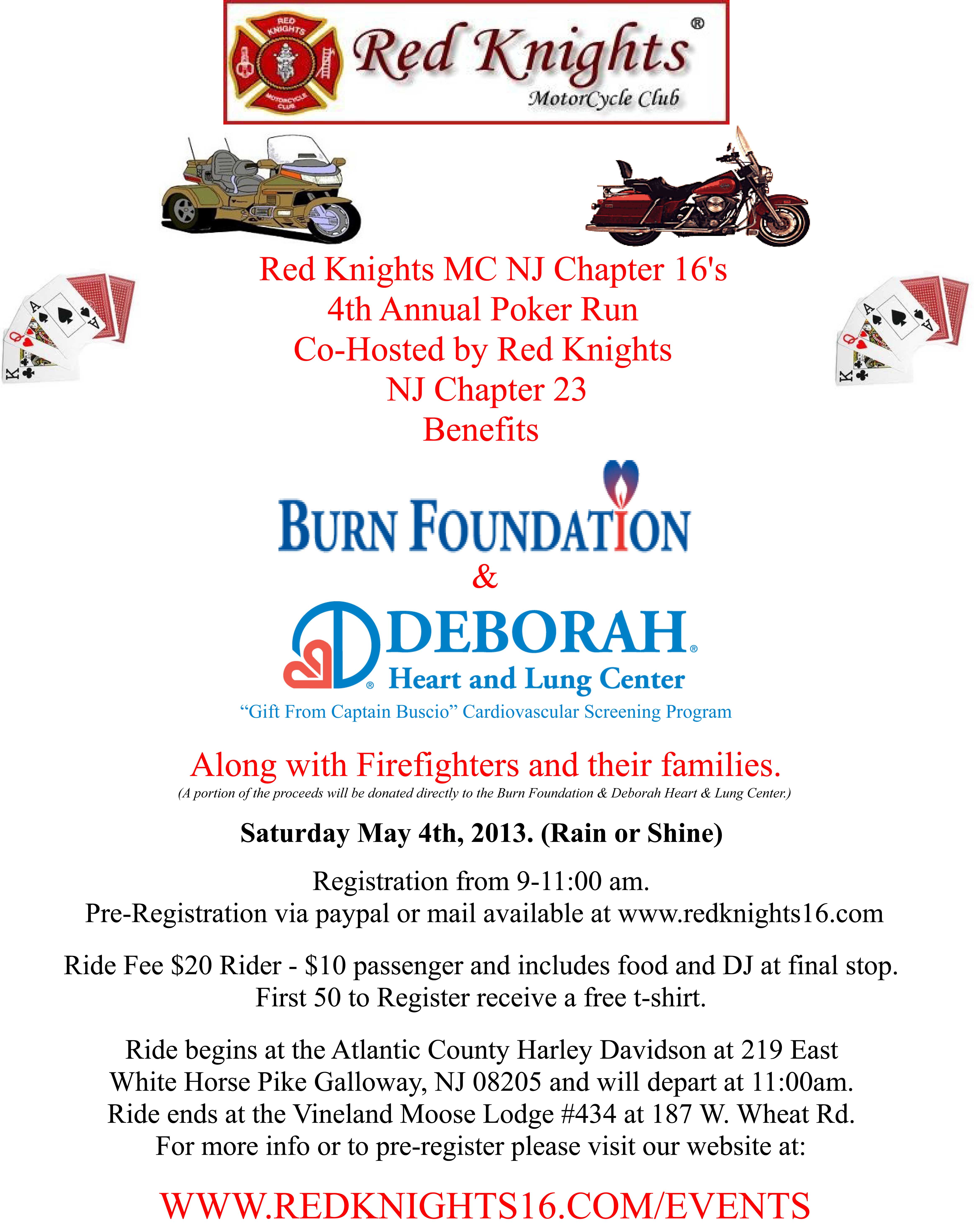 The ride starts at Atlantic County Harley-Davidson, 219 East White Horse Pike in Galloway. Registration begins at 9:00 am and the motorcycles go out at 11:00 am rain of shine. The ride fee is $20.00 for the rider and $10.00 for a passenger. The fee includes food and music at the end of the ride. The first 50 to register will receive a t-shirt. Pre-registration is available online. A portion of the proceeds will be donated directly to the Burn Foundation, Deborah Heart & Lung Center and to Firefighters and their families. For more information go to http://redknights16.com/events.htm.