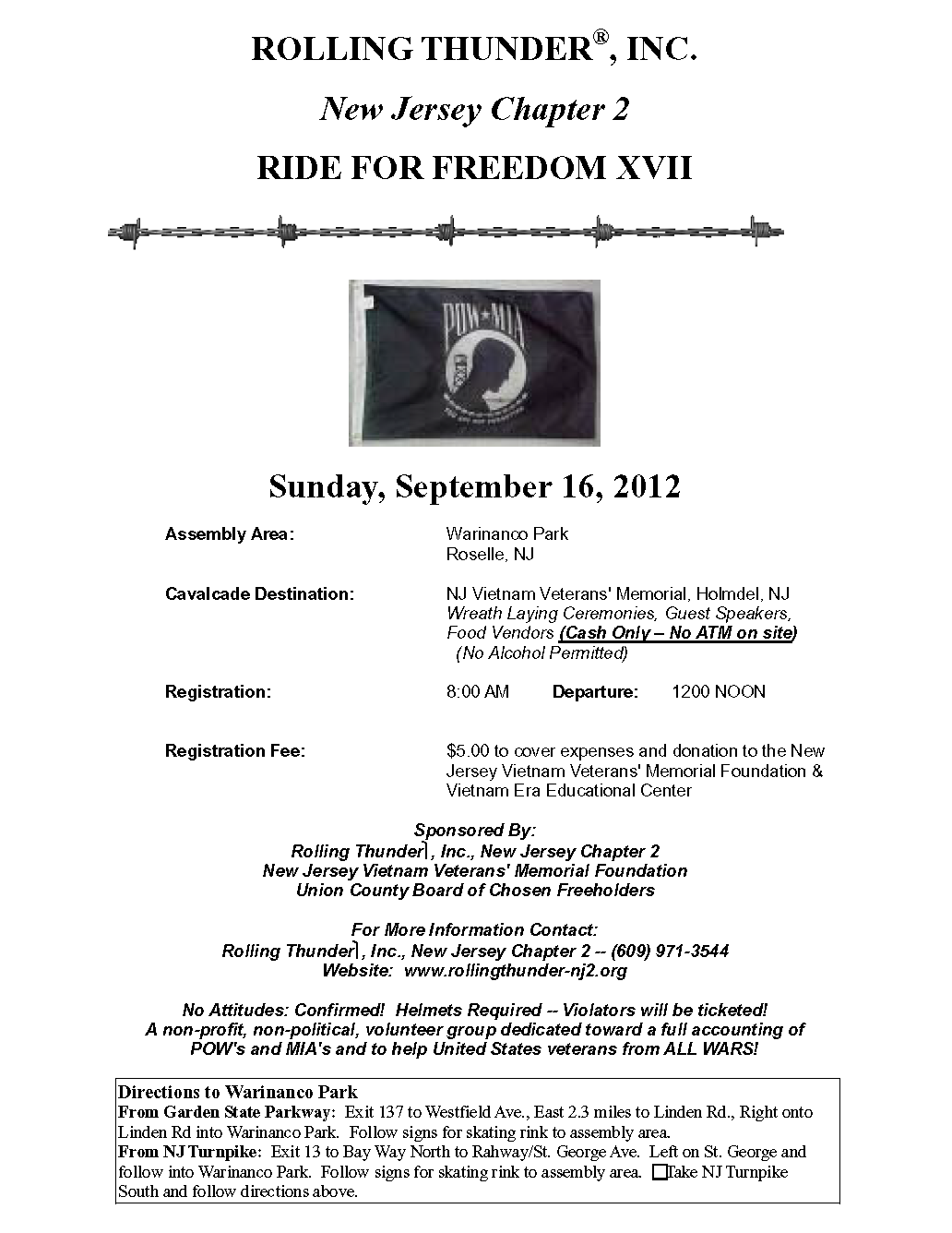 Assembly Area. Warino Park, Roselle, NJ. Cavalcade Destination: NJ Veterans Memorial, Holmdel, NJ. Wreath Laying Ceremonies.Guest Speakers, Food Vendors. Cash Only. NO ATM on site. No alcohol permitted. Sponsored by Rolling Thunder, NJ Chapter 2. See flyer below