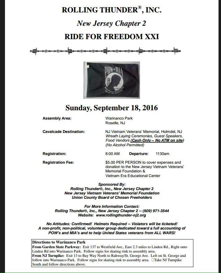 ROlling Thunder Poker Run. August 28th Rain or Shine. Registration 9-11am. Starts at Tramontin HD, Rt 80 Exit 12, Hope, NJ. 3 Stops along a very scenic route thru Warren & Sussex Counties. Run ends at Lions Club Pavilion, Knowlton, NJ. Food, Music, Prizes, Vendors, Fun & Games 12-5pm. Prizes for top 3 poker hands submitted by 2:30pm @ end of run. $20 Rider, $20 Passenger, $20 Walk-In $15 age 12+ under 12 free.