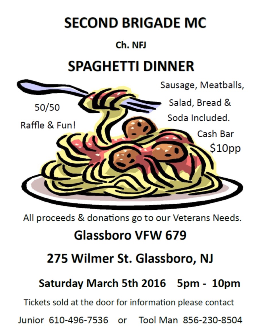 Sausage, Meatballs, Salad, Bread and Soda included. Cash Bar . 50/50. $10 per person. Tickets sold at door. Questions call Tool at 856-230-8504