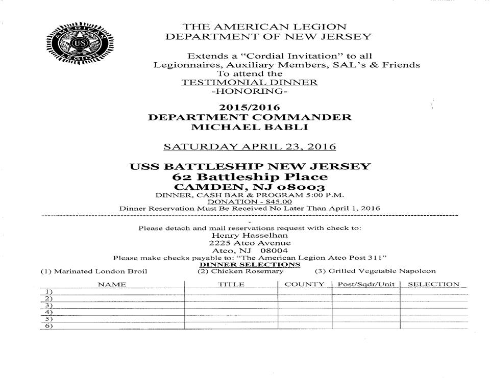 American Legion Dept of NJ invites all Legionnaires, Auxiliary members, SALs and friends to attend the Testimonial Dinner honoring 2015/2016 Dept Commander Michael Babli. Saturday, April 23rd on the Battleship NJ. Dinner, Cash Bar & Program. 5pm. Donation $45. Must reserve seats no later then April 1st. Make checks payable to American Legion Atco Post 311. Print form and send in.