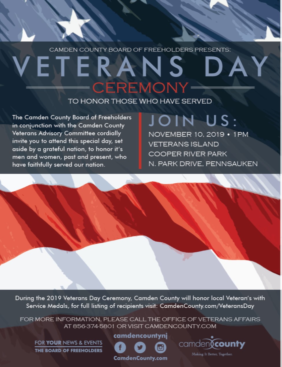 Please join the Camden County Board of Freeholders and the Camden County Veterans Advisory Committee on Sunday, November 10, 2019 at 1:00PM on Veterans Island at Cooper River Park for a Veterans Day Event honoring the men and women, past and present, who have faithfully served our nation.