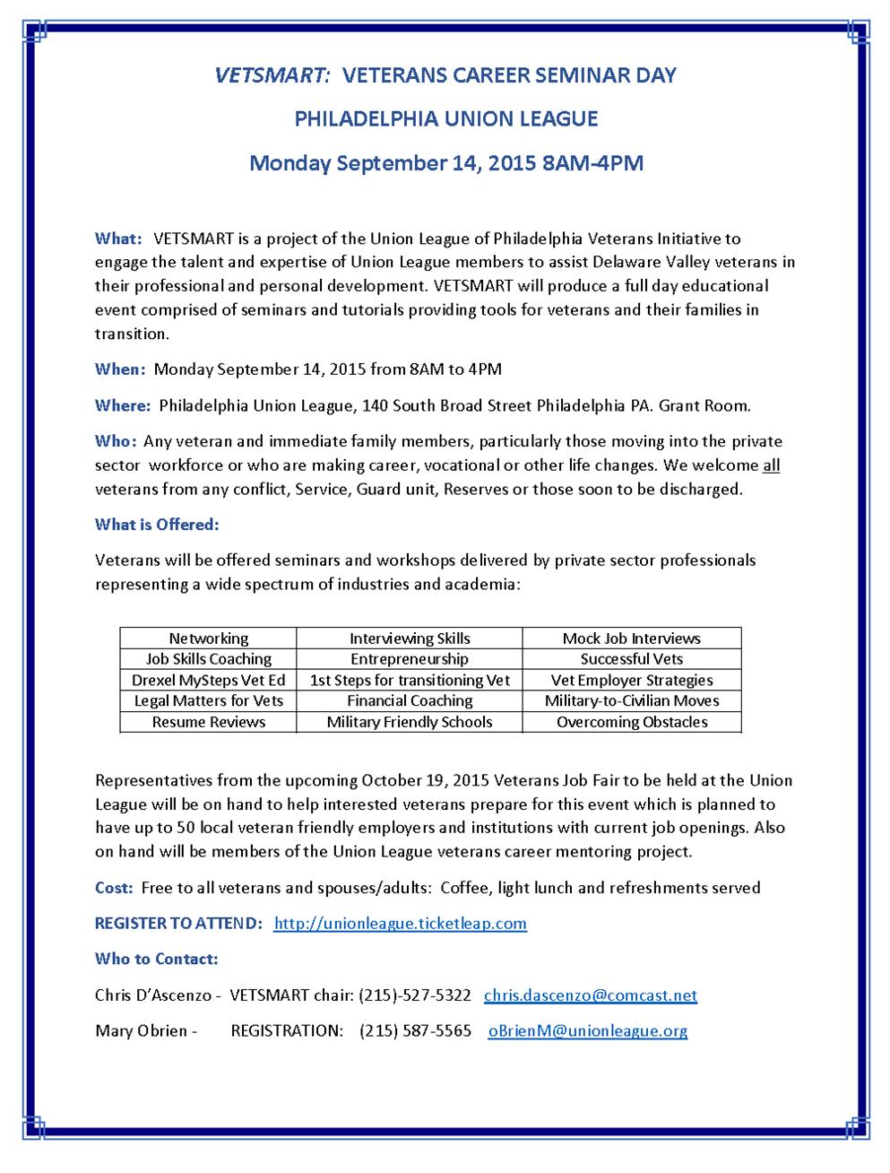 VETSMART is a project of the Union League of Philadelphia Veterans Initiative to engage the talent and expertise of Union League members to assist Delaware Valley veterans in their professional and personal development. VETSMART will produce a full day educational event comprised of seminars and tutorials providing tools for veterans and their families in transition. Any veteran and immediate family members, particularly those moving into the private sector workforce or who are making career, vocational or other life changes are welcomed. We welcome all veterans from any conflict, Service, Guard unit, Reserves or those soon to be discharged. Veterans will be offered seminars and workshops delivered by private sector professionals representing a wide spectrum of industries and academia. Free to all veterans and spouses/adults:  Coffee, light lunch and refreshments served REGISTER TO ATTEND:   http://unionleague.ticketleap.com More info, see flyer or contact Chris at (215)-527-5322 chris.dascenzo@comcast.net