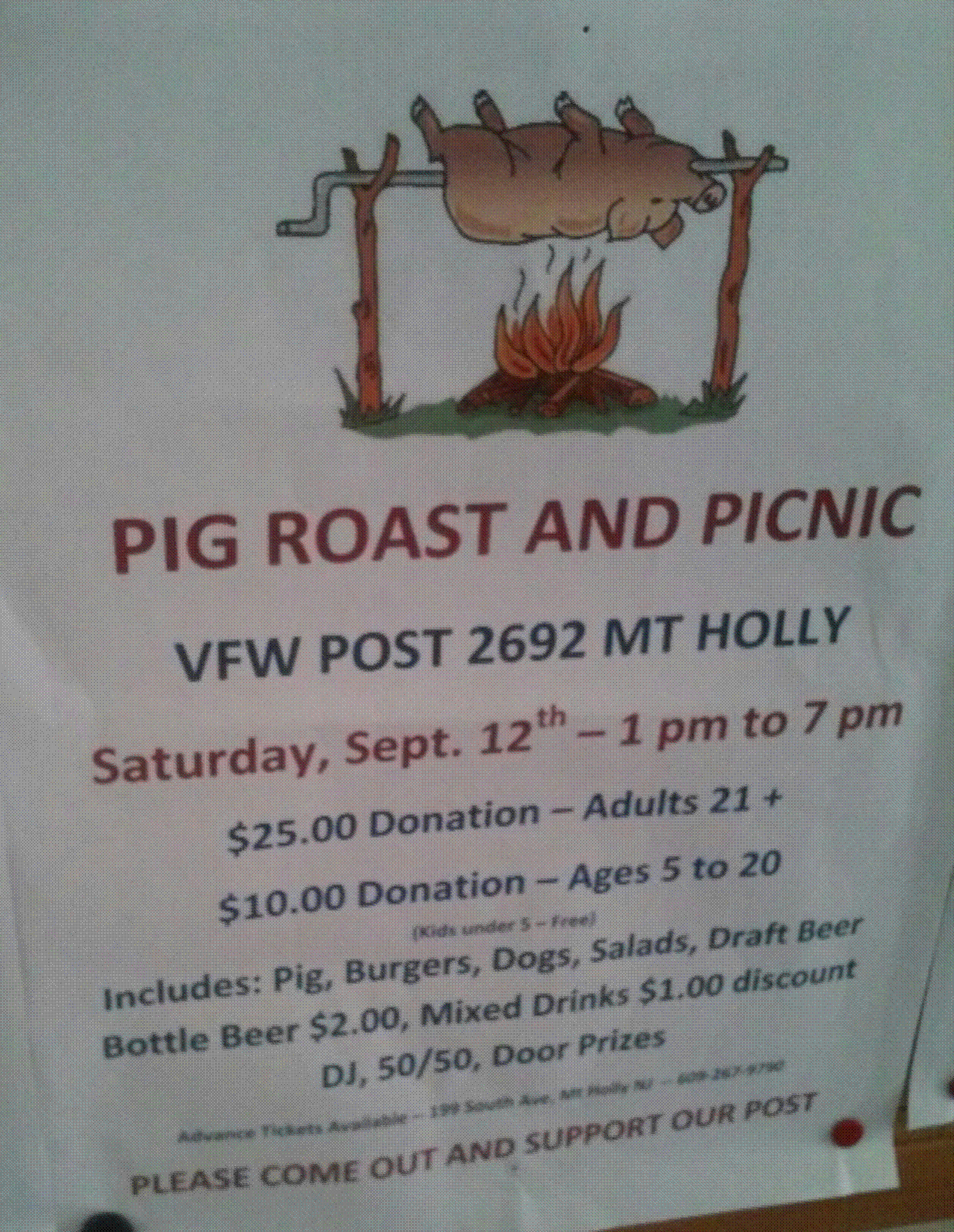 Includes Pig, Burgers, Dogs, Salads, Draft Beer, Bottle Beer $2, Mixed Drinks $1 discount. DJ, 50/50, Door Prizes. $25 Donation Adults 21 +. $10 donation ages 5 to 20.