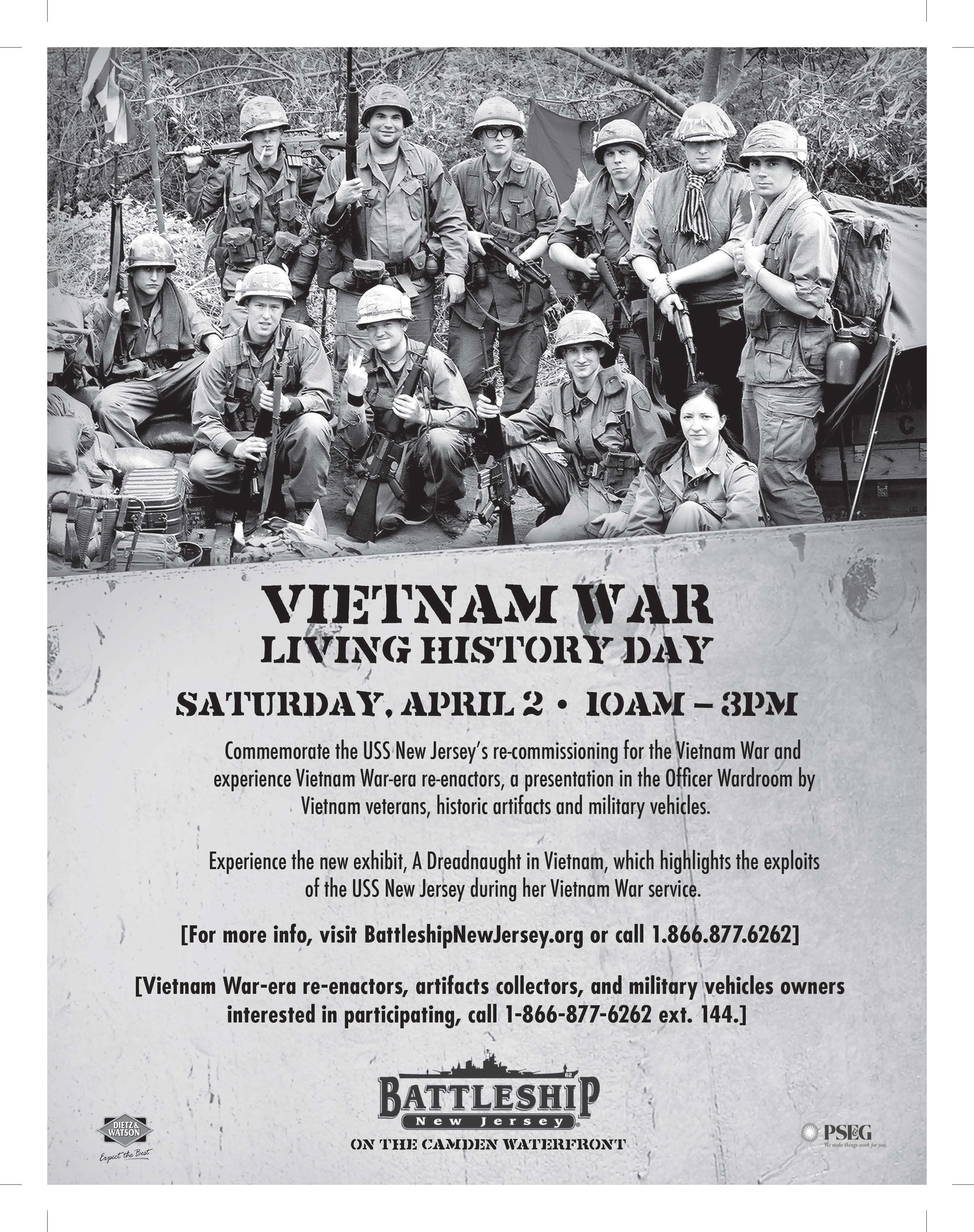 WANTED: Vietnam War artifact owners and re-enactors. You can not only display your artifacts or uniform with guests touring the Battleship, but we will also give all participants a complimentary tour and a free lunch! To register, email groups@battleshipnewjersey.org.