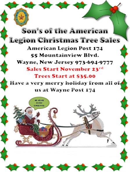 American Legion Post 174 SALS, located in Wayne, NJ are selling Xmas trees, beginning November 23rd. Trees start at $35. Call 973-694-9777 for details