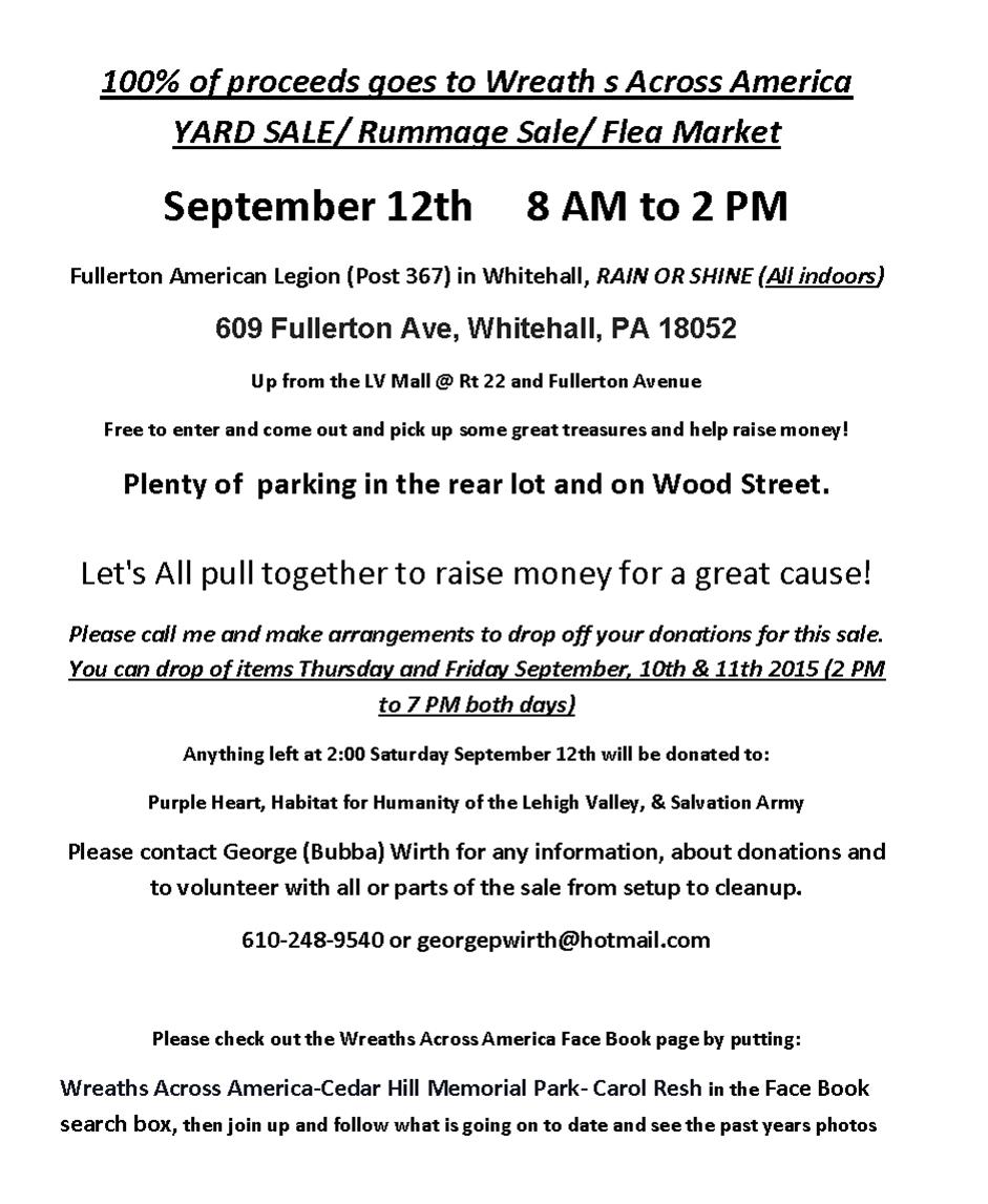 DONATIONS: Let’s All pull together to raise money for a great cause! Please call me and make arrangements to drop off your donations for this sale. You can drop of items Thursday and Friday September, 10th & 11th 2015 (2 PM to 7 PM both days) Anything left at 2:00 Saturday September 12th will be donated to: Purple Heart, Habitat for Humanity of the Lehigh Valley, & Salvation Army. Please contact George (Bubba) Wirth for any information, about donations and to volunteer with all or parts of the sale from setup to cleanup.