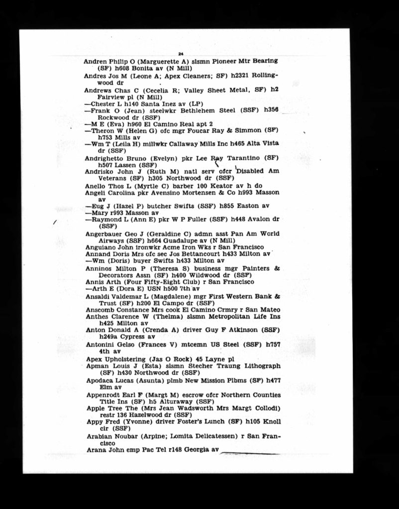 Lucas Apodaca and his wife, Asunta, lived at 477 Elm St, San Bruno, Ca. Lucas was then a plumber, working for New Mission Plumbing. They had the following children; June 1, 1943, Susan Lou Apodaca; November 12, 1945, Nancy Joan Apodaca; November 15, 1947, Peter Michael Apodaca; February 16, 1952, Richard Anthony Apodaca - they were all born in San Bruno/San Francisco, CA. (see city directories)