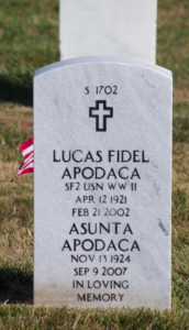 Peter and his parents, Lucas and Asunta Apodaca are buried in Golden Gate National Cemetery, San Bruno, San Mateo County, California