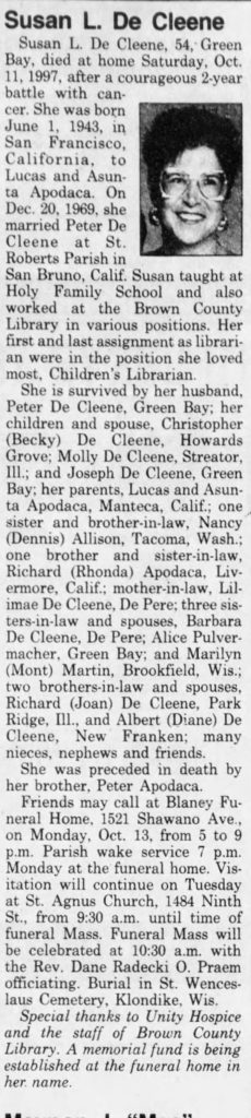 Peter's Sister - Susan Lou Apodaca, born June 1, 1943, married Peter DeCleene on December 20, 1969 in St Roberts Parish in San Bruno, CA and then moved to Green Bay, WI. She taught at Holy Family School and also worked at the Brown County Library. She died of cancer on Oct 11, 1997. She was survived by her husband, Peter DeCleene, son Christopher (Becky) DeCleene of Howards Grove, WI, Molly DeCleene of Streator, IL, son Joseph DeCleene of Green Bay, her parents Lucas and Asunta of Manteca CA, sister Nancy (Dennis) Allison of Tacoma, WA and brother Richard (Rhonda) Apodaca of Livermore, CA along with other in-laws.She is buried in St Wenceslaus Cemetery, Klondike, Wisconsin.