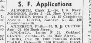 By June 1942, Lucas is living in CA and marriage application was filed - his financee, soon to be wife, Asunta Gianni, was 17 years old and lived at 189 Hale St, San Francisco, Ca. (see newspaper article)