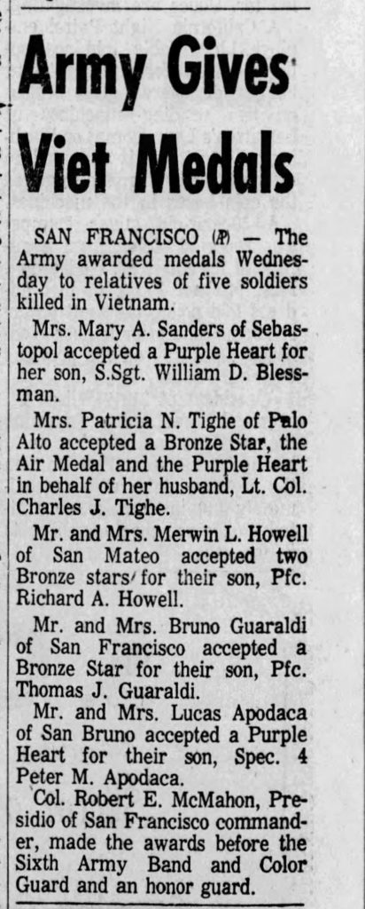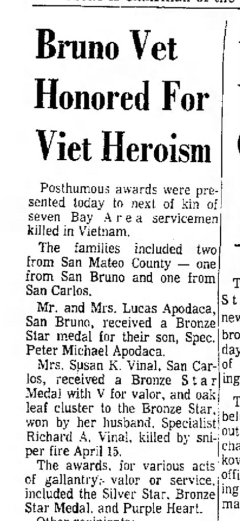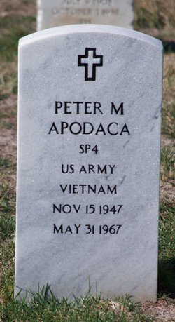 Peter Michael Apodaca, born November 15, 1947 -  Army - and is KIA May 31,1967 in Vietnam.
