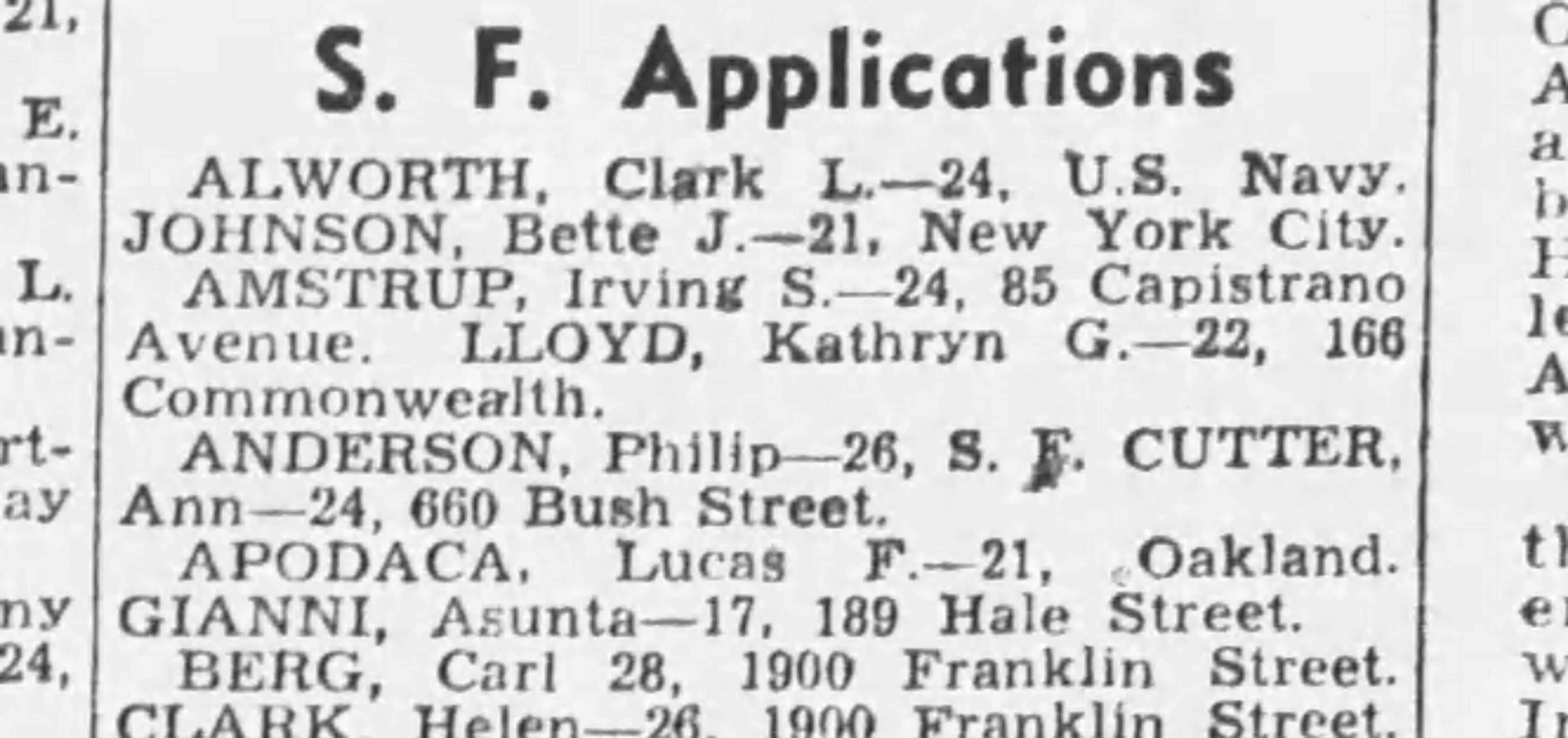 By June 1942, Lucas is living in CA and marriage application was filed - his financee, soon to be wife, Asunta Gianni, was 17 years old and lived at 189 Hale St, San Francisco, Ca. (see newspaper article)