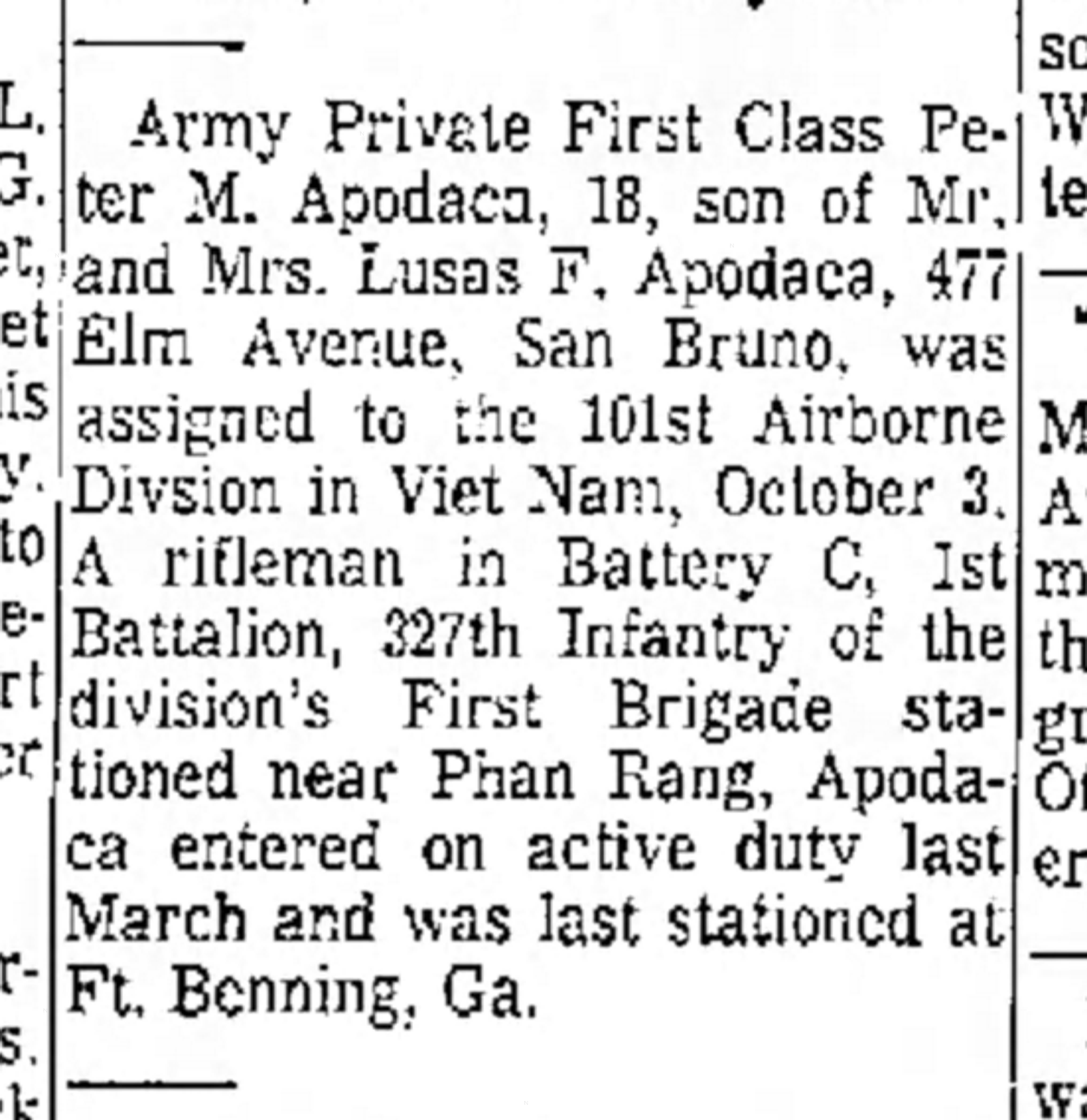 Peter Michael Apodaca, born November 15, 1947 -  Army - and is KIA May 31,1967 in Vietnam.