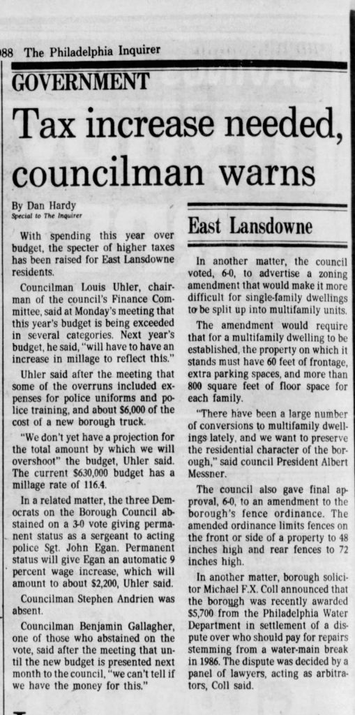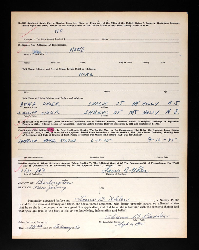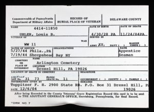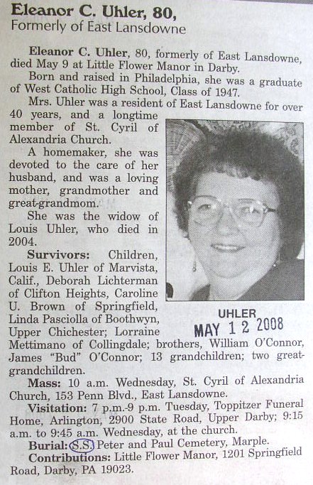 Louis Uhler - Graduate of West Philadelphia High School; Worked as a photo engraver for Becken Graving of Philadelphia more than 20 years; became supervisor of Ushers for the Philadelphia Phillies; As a young man he was a clown diver with his twin brother Elliot at the Steel Pier in Atlantic City; Elliot died in 1977; Served on the Lansdowne Borough Council as Republican Committeman