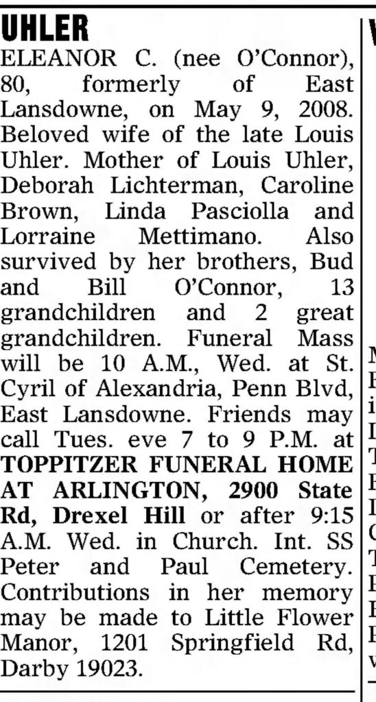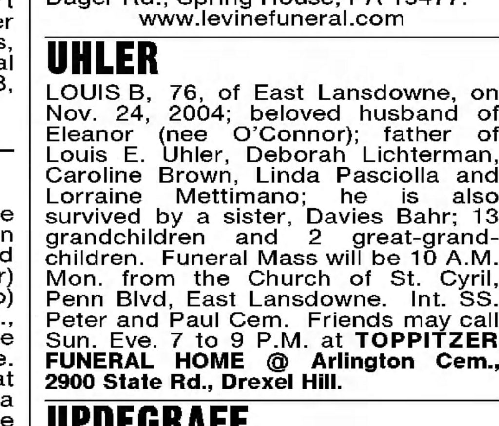 Louis Berule Uhler and his wife Eleanor O'Connor had the following children; Louis E, Deborah, Caroline, Linda, and Lorraine.