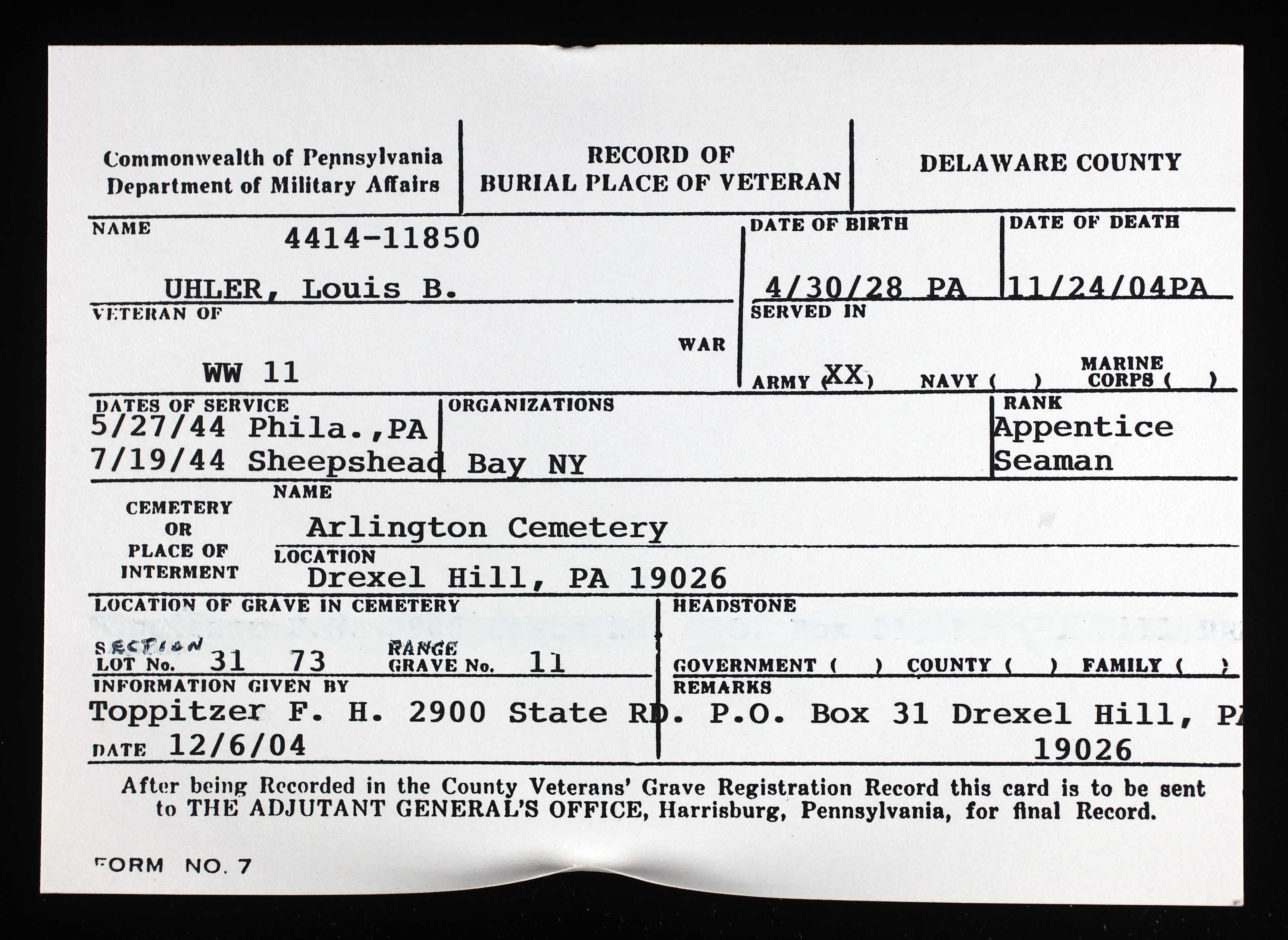 DEATH: 24 NOVEMBER 2004 Lansdowne, Delaware, Pennsylvania