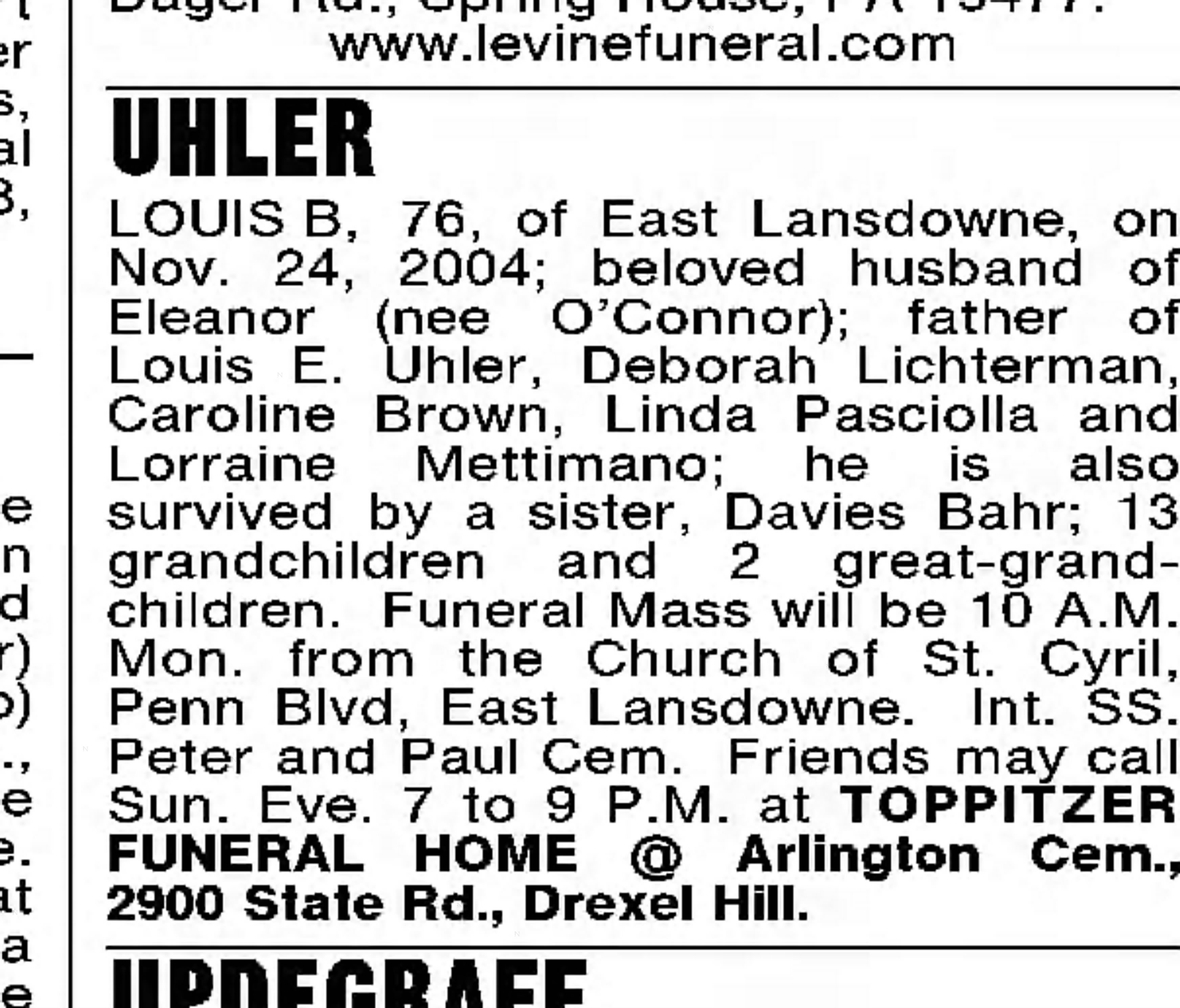 Louis Berule Uhler and his wife Eleanor O'Connor had the following children; Louis E, Deborah, Caroline, Linda, and Lorraine.