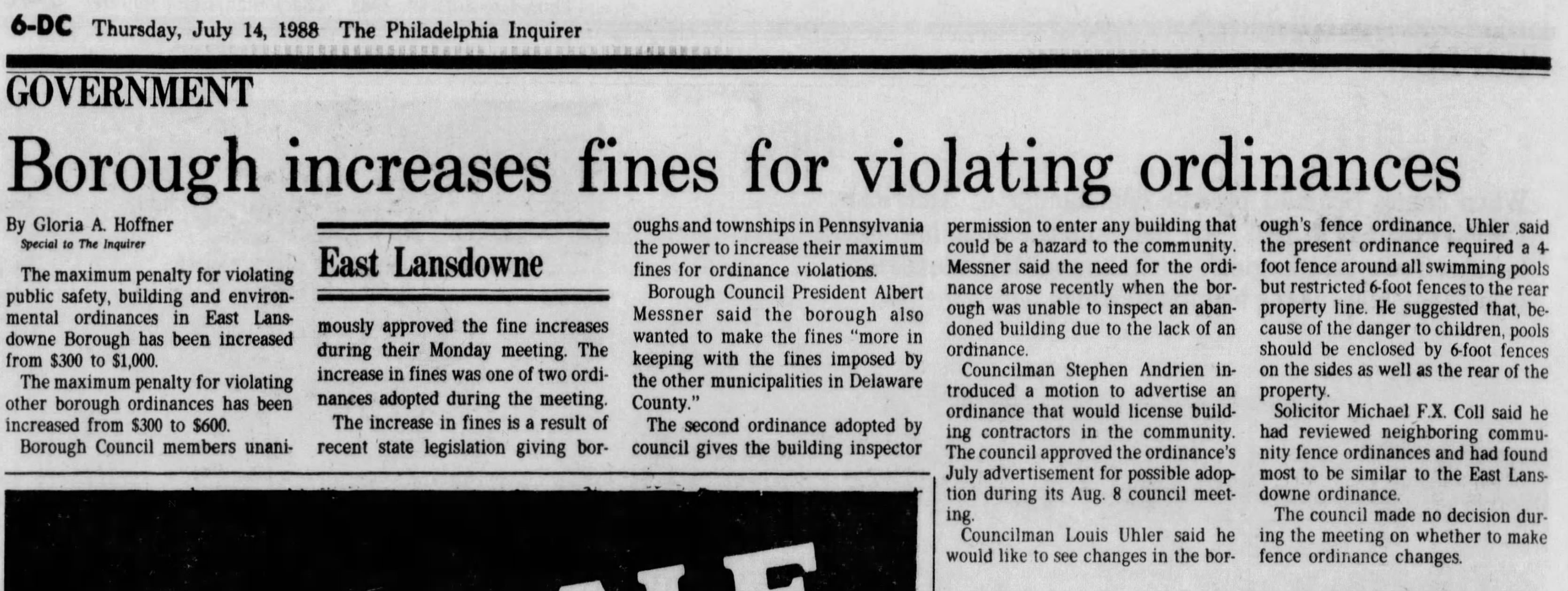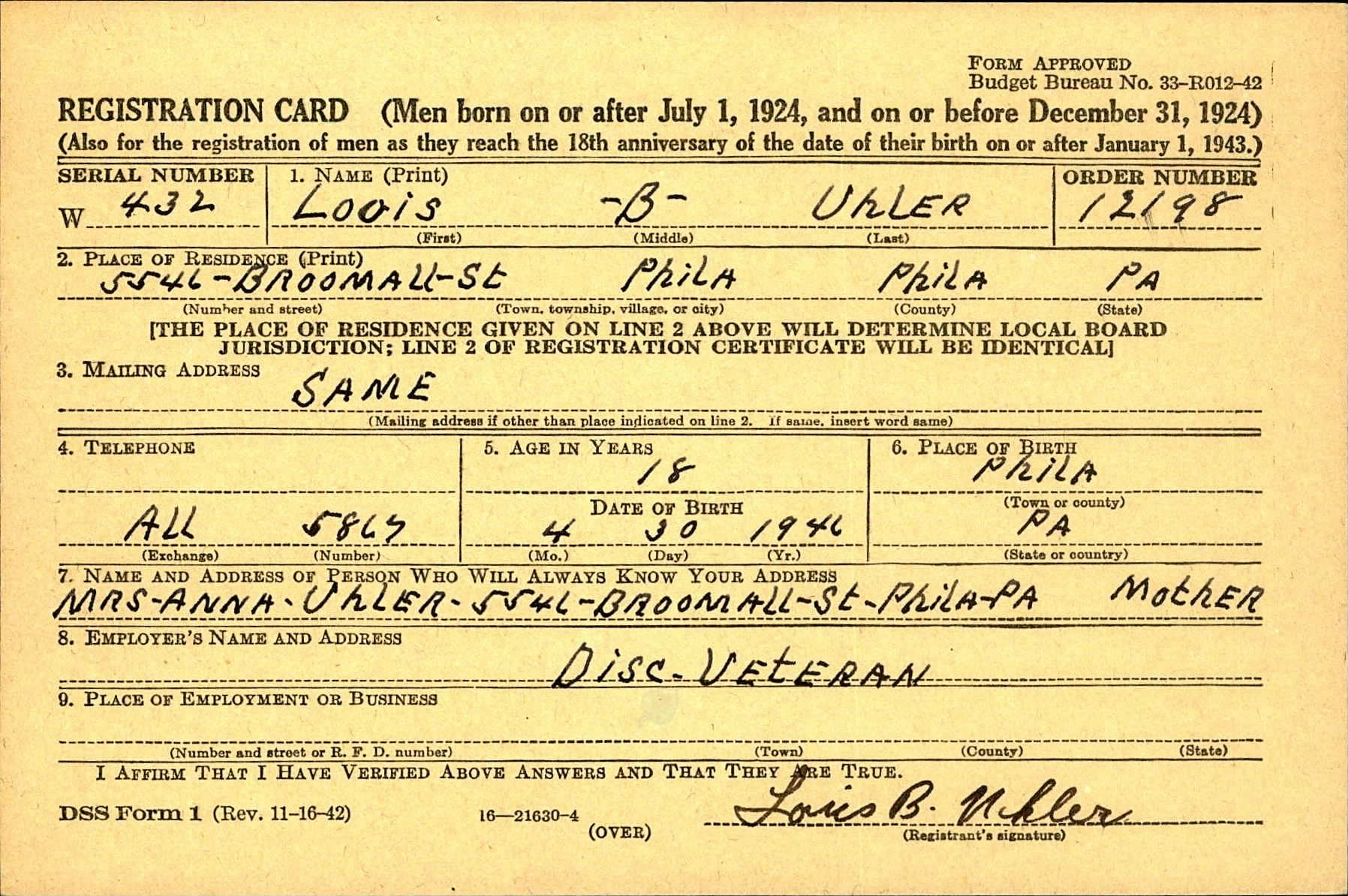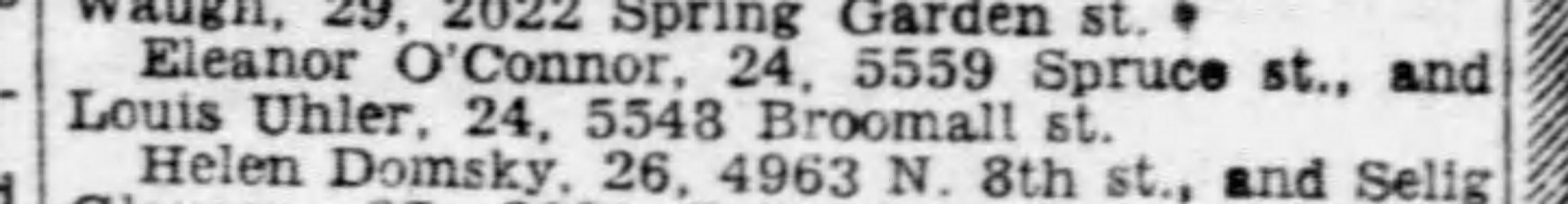 Louis Uhler - Graduate of West Philadelphia High School; Worked as a photo engraver for Becken Graving of Philadelphia more than 20 years; became supervisor of Ushers for the Philadelphia Phillies; As a young man he was a clown diver with his twin brother Elliot at the Steel Pier in Atlantic City; Elliot died in 1977; Served on the Lansdowne Borough Council as Republican Committeman