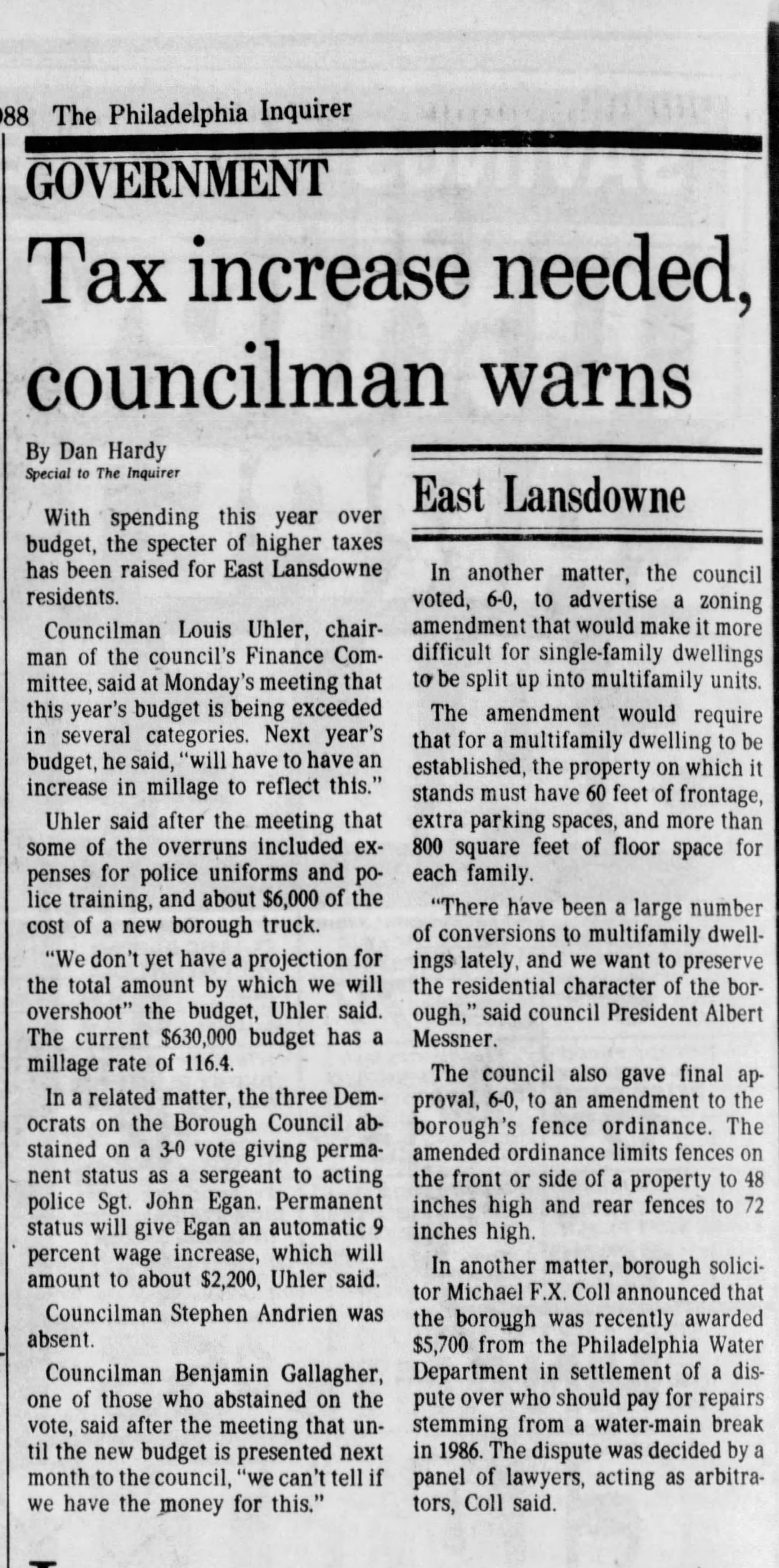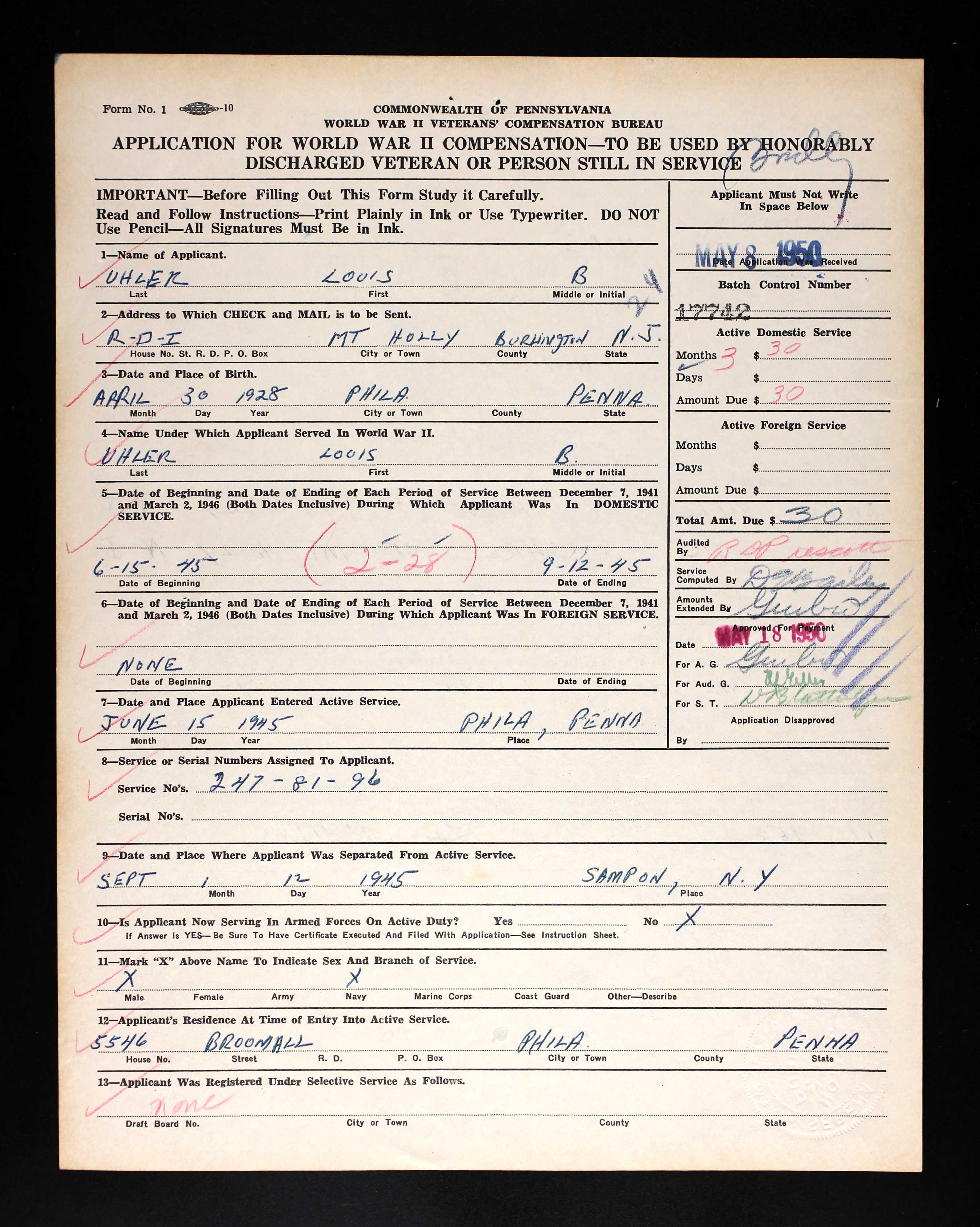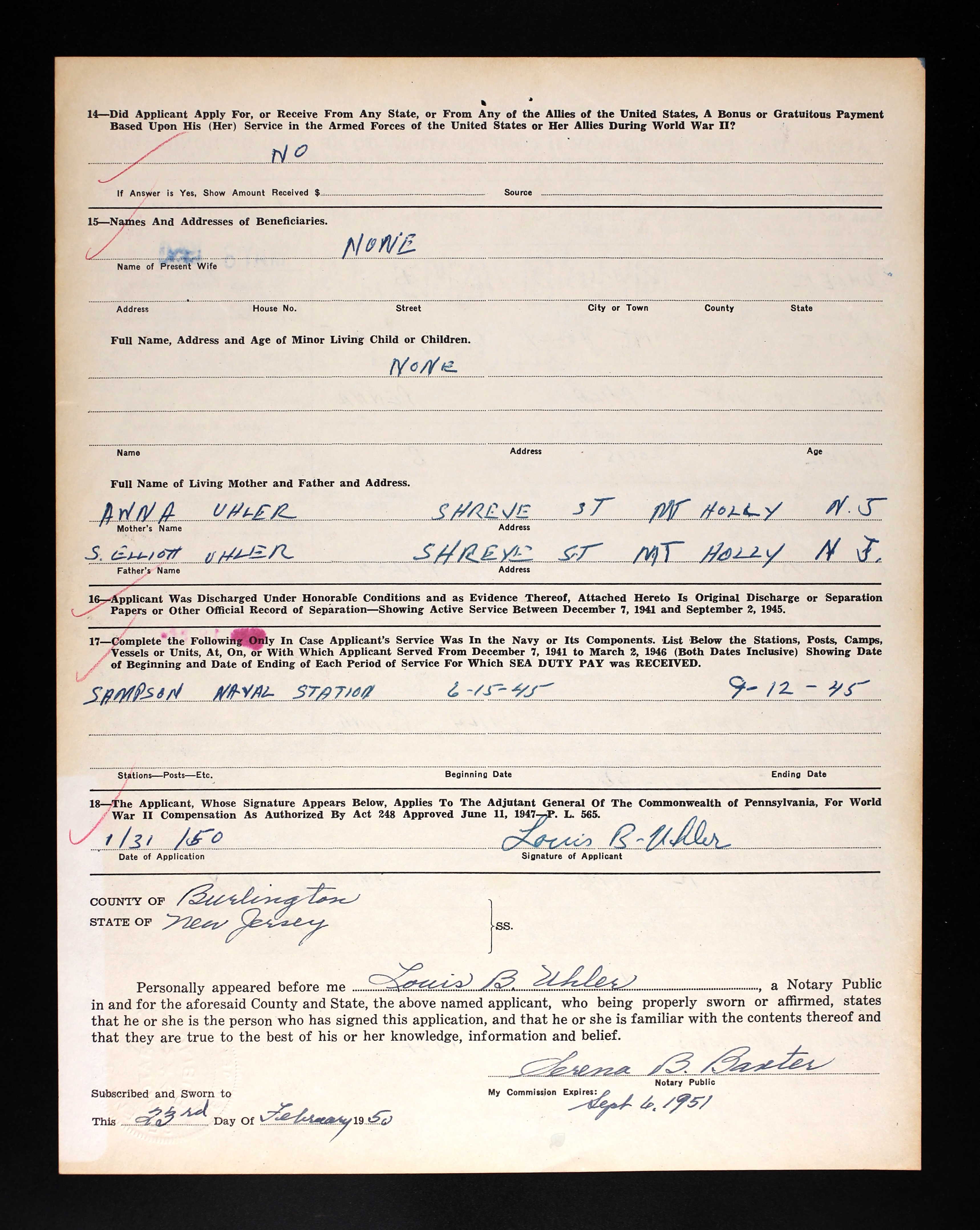 Louis Uhler - Graduate of West Philadelphia High School; Worked as a photo engraver for Becken Graving of Philadelphia more than 20 years; became supervisor of Ushers for the Philadelphia Phillies; As a young man he was a clown diver with his twin brother Elliot at the Steel Pier in Atlantic City; Elliot died in 1977; Served on the Lansdowne Borough Council as Republican Committeman